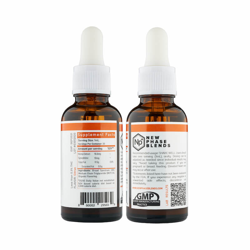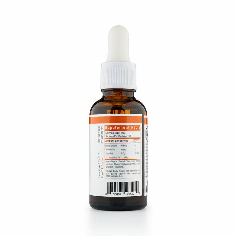 | Ingredients | Active Ingredient(s): Synephrine Ingredients: Broad Spectrum CBD, Medium-chain Triglyceride (MCT) Oil, Organic Flavoring |